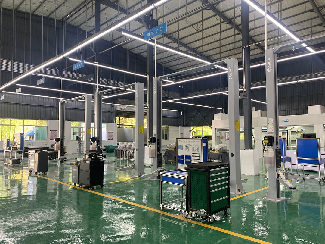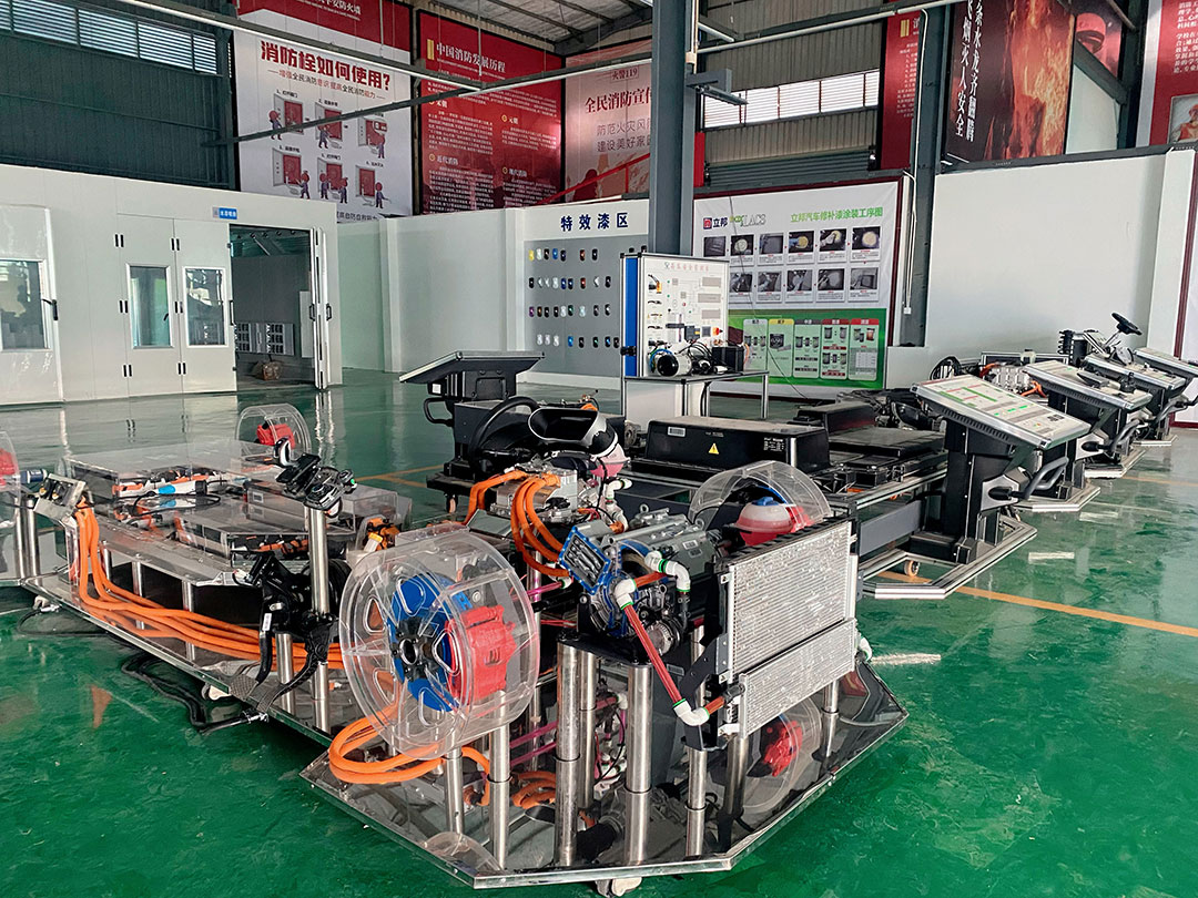 学校新能源汽车实训基地,占地面积2000多平方,总投资800多万元。实训室建有集生产、实训、技能培训为一体的高标准钣喷中心和新能源电池维保中心供学生学习使用。